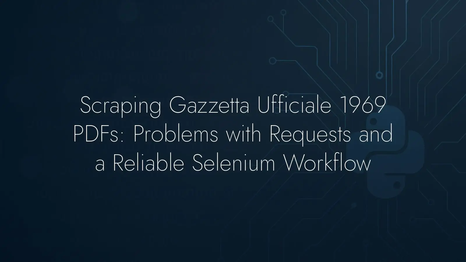 Scraping historical PDFs from the Italian Gazzetta Ufficiale – Serie Generale for 1969 looks deceptively simple: there is a public archive, detail pages per issue, and a familiar-looking download endpoint. In practice, static approaches often surface no links at all, and hand-crafted download URLs return HTML error pages instead of binary PDFs. Below is a concise walkthrough of why this happens and how to reliably automate the downloads with Selenium.