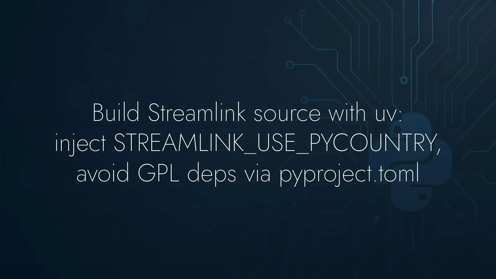 Packaging Streamlink in a corporate environment often comes with strict compliance requirements. Two constraints tend to surface right away: the package must be built from source and it must avoid GPL-licensed dependencies. With pip this is straightforward by combining a source build with the STREAMLINK_USE_PYCOUNTRY=1 environment variable. The friction starts when migrating the workflow to uv, where the package build runs in an isolated environment and silently ignores shell-provided variables during add or pip operations.