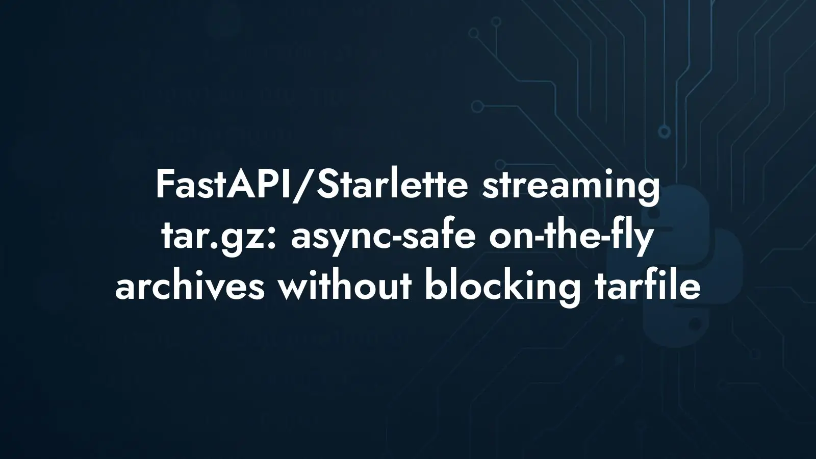 Streaming a tar.gz archive straight from FastAPI/Starlette sounds simple until you meet the mismatch between a synchronous tarfile writer and an asynchronous HTTP response. If your code tries to pipe tarfile output directly into StreamingResponse, you quickly discover that TarFile writes to file-like objects via a synchronous write call, while Starlette expects an async generator or an async send. That friction is exactly what derails on-the-fly archiving for large files fetched from another backend.