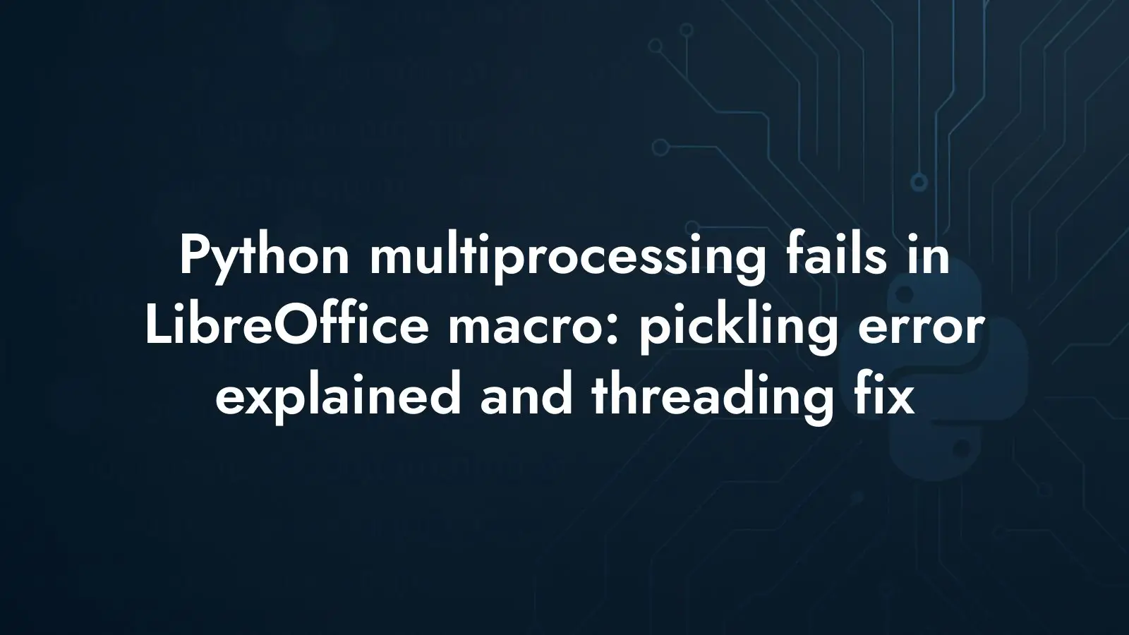 If you need background execution inside a LibreOffice macro, prefer threading over multiprocessing. It integrates cleanly with the macro environment, avoids pickling errors tied to the scripting module, and doesn’t depend on the Windows __main__ guard. Keep in mind the nature of your workload: when the work is I/O bound, threads will usually do fine; beyond that, threading won’t always be a suitable stand-in for processes.