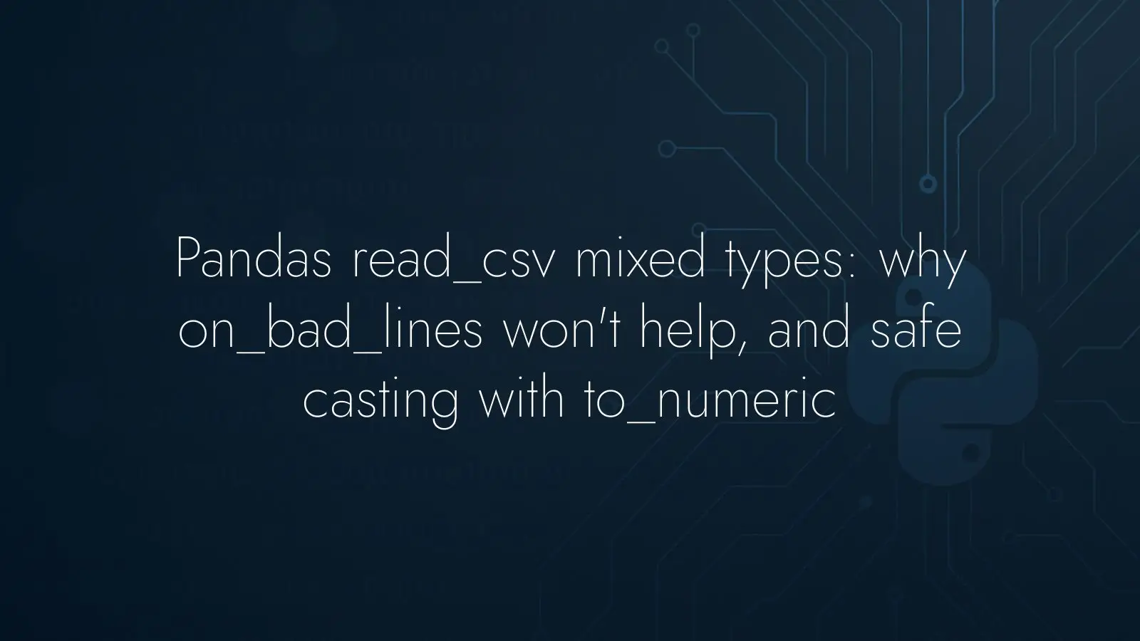 Don’t rely on on_bad_lines for type issues; it only addresses structural parse errors like unexpected field counts. Read ambiguous columns as strings first, then convert with pandas.to_numeric and an explicit errors policy. If you need to keep non-numeric values, implement a small safe caster rather than leaning on deprecated behavior. This approach produces clearer intent, better error handling, and cleaner data flows.