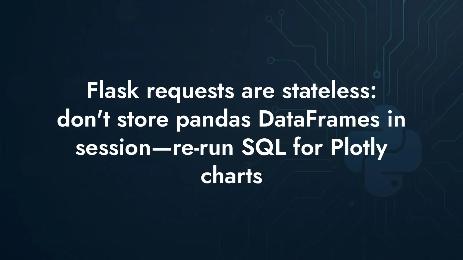 Learn why Flask requests are stateless, why storing a pandas DataFrame in session fails, and how to re-run SQL and render Plotly charts from query results.