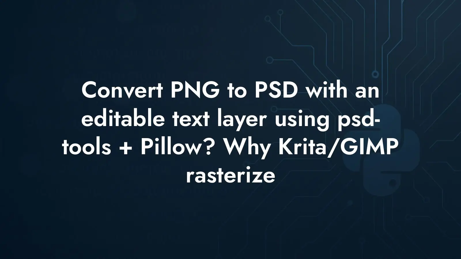 Packaging a PNG together with an editable text layer into a PSD sounds trivial until you try to open the result in Krita or GIMP and discover the text isn’t actually editable. If you’re using psd-tools with Pillow, the text often ends up rasterized, which defeats the purpose of keeping a live text layer for later editing.