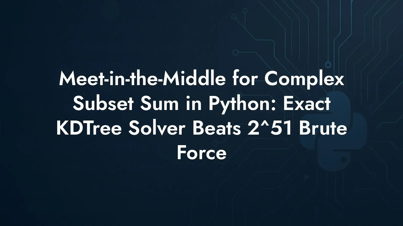 Solve the complex-number subset sum exactly in Python. Meet-in-the-middle with KDTree cuts 2^51 brute force to 2^(n/2). Includes numba, SciPy code results.