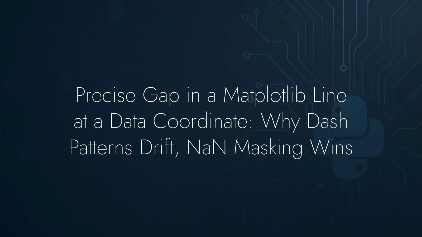 When a line needs a deliberate break at a specific data coordinate, avoid manipulating dash patterns. Insert boundary vertices around the target and use nan masking to cut the path. Remember that Matplotlib dash sequences are specified in points, and mixing spaces is what makes the dash-based approach unreliable. Keep the gap logic in data space, and reach for a LineCollection only if you move to piecewise segments and need the efficiency of a batched collection.