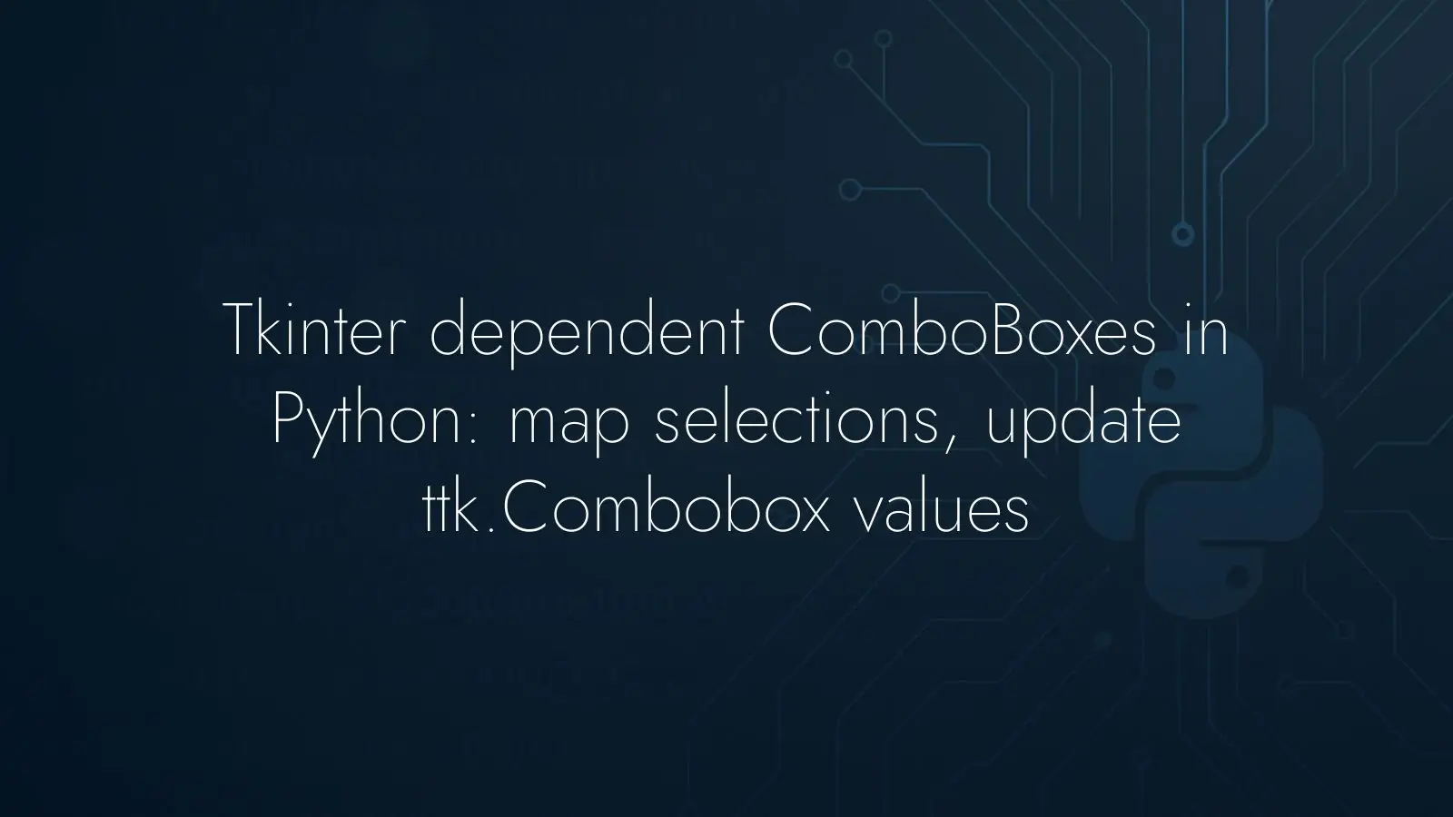 Use a dictionary to map the first ComboBox’s selection to the second ComboBox’s options. Bind a callback to the first ComboBox that updates the second ComboBox’s values and selects a default item. This keeps behavior predictable and the code compact.