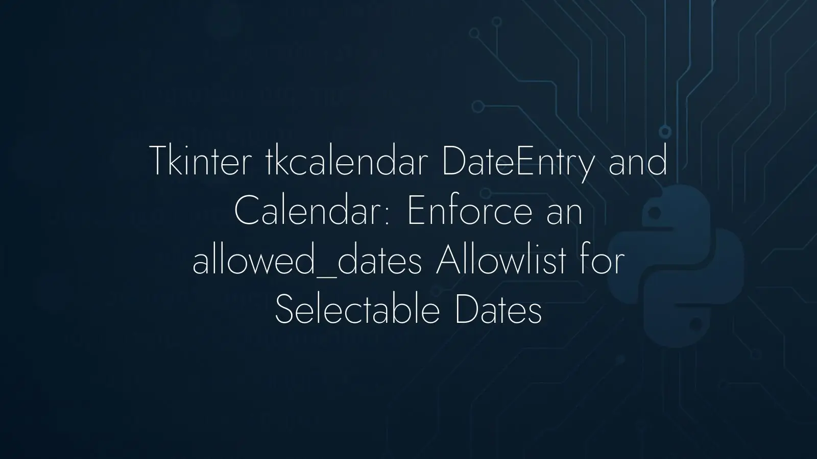If you need a true allowlist, pass allowed_dates as datetime.date objects and disable every non-allowed cell during rendering of the calendar. Convert your string inputs with date.fromisoformat, keep the allowlist sorted, and adjust mindate and maxdate whenever you add or remove items so your range and allowlist stay consistent. If you integrate with DateEntry, expect that some additional functions may need alignment to reflect the allowlist rules everywhere, and consult the tkcalendar sources in tkcalendar.calendar_ and tkcalendar.dateentry to locate the relevant hooks. If modifying the calendar isn’t feasible for your timeline, selecting from a dropdown tied to the same allowlist is a workable alternative.