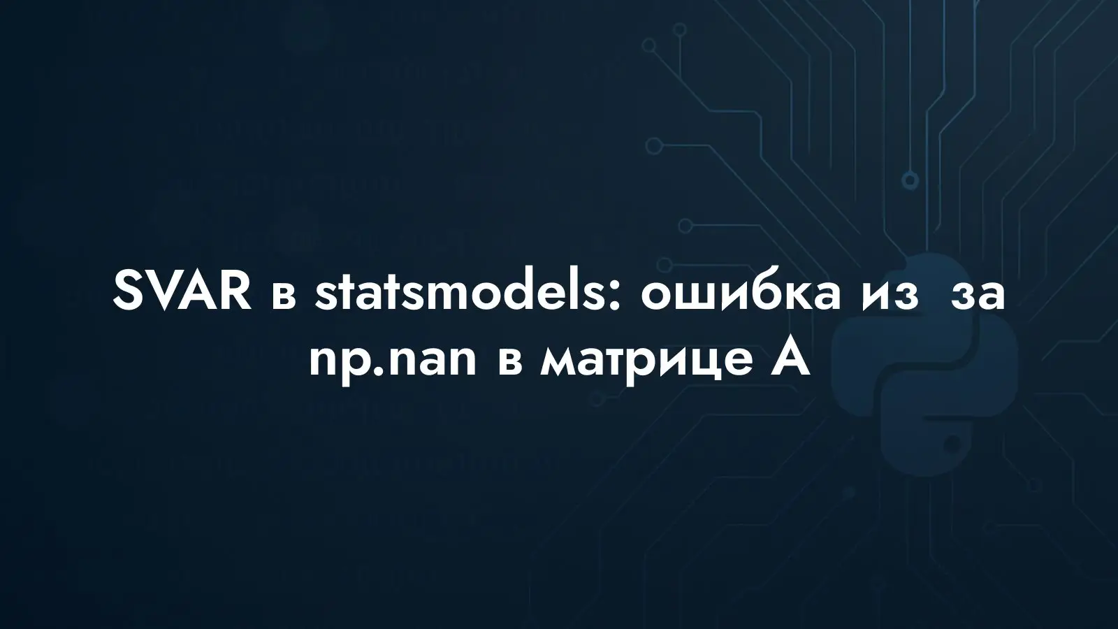 Если подгонка SVAR падает с “zero-size array to reduction operation maximum which has no identity” при использовании np.nan в матрице A, замените эти записи на 'E' и задайте тип матрицы object, как показано выше. Эта правка воспроизводимо устраняет проблему и возвращает процесс оценки в рабочее русло. При отладке проверяйте, что на самом деле лежит в ваших переменных, и всегда сохраняйте полный вывод об ошибке — так диагностика идёт быстрее. Когда матрица ограничений задана последовательно, statsmodels выполняет оценивание SVAR как ожидается.