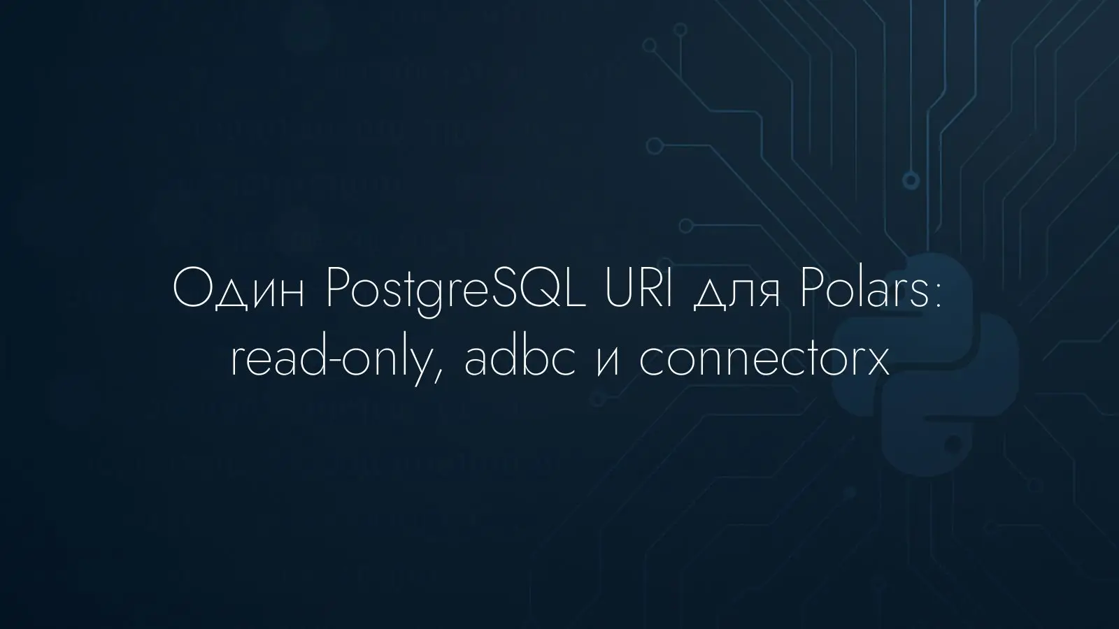 При переносе данных между PostgreSQL и Polars хочется унифицировать одну строку подключения (URI) и использовать её во всех движках. Препятствие — принудительный режим только для чтения через параметр options в URI PostgreSQL. Движок adbc принимает URI с опциями вроде default_transaction_read_only=True, тогда как connectorx не поддерживает дополнительные параметры. Задача — оставить один URI и переключать режим read-only по необходимости, не ведя вручную две версии.