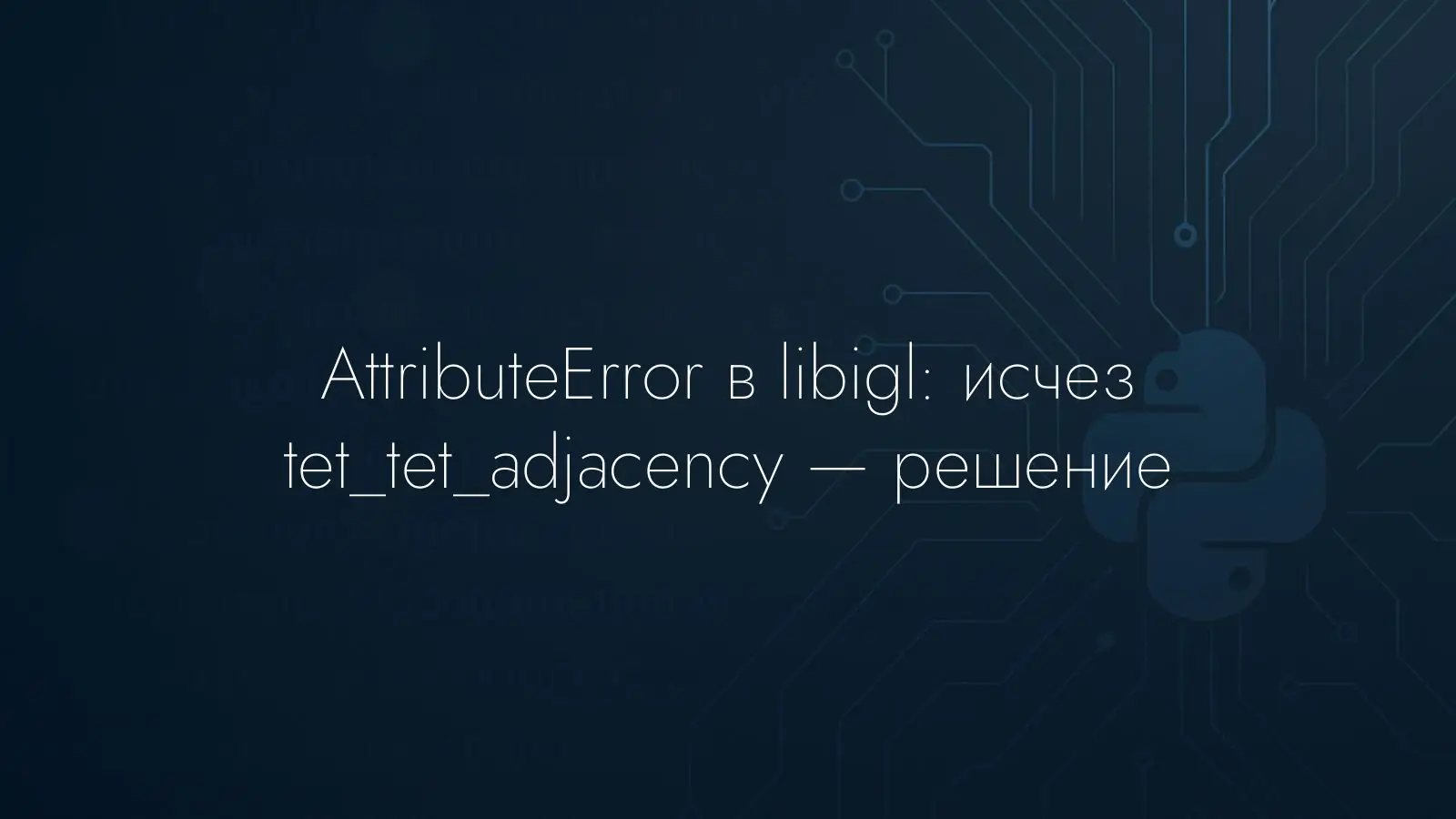 Запускаешь старый исследовательский скрипт — и внезапно вылетает AttributeError: module 'igl' has no attribute 'tet_tet_adjacency — легко потерять терпение. Этот конкретный сбой проявляется при запуске примера fracture-modes: шаг «взрыва» сетки опирается на Python‑биндинги libigl. Раньше код работал, но в более новой среде нужный атрибут исчез. Источник поломки — изменения в биндингах libigl, а не ошибка в самом скрипте.